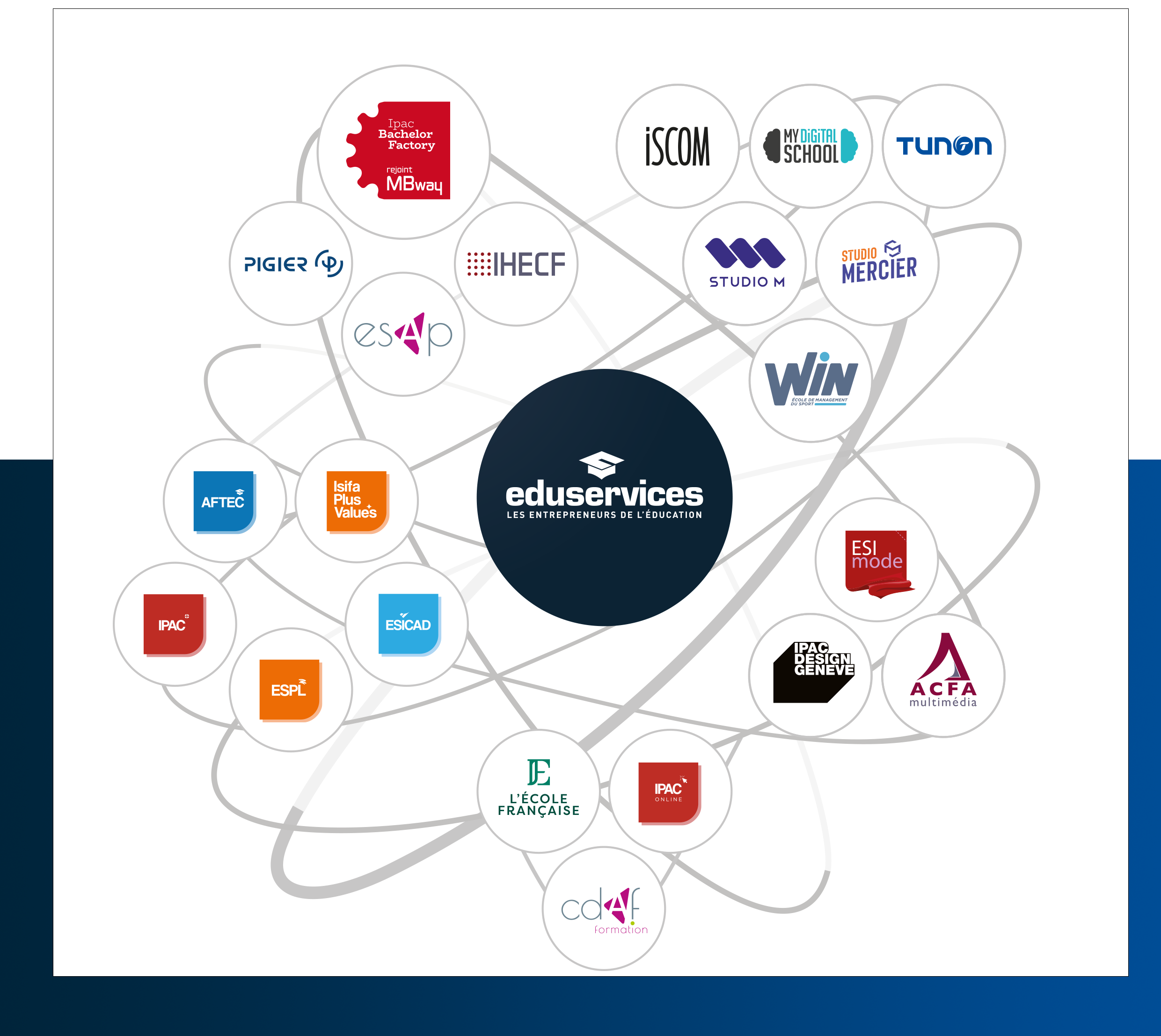 Eduservices possède 10 enseignes nationales : Ecole Internationale Tunon, Ipac Bachelor Factory, IHECF ISCOM, MyDigitalSchool, MBway, Pigier, Win, Studio M, Studio Mercier et 8 leaders régionaux : AFTEC, ESICAD, ESPL, IPAC, Isifa Plus Values, Ipac Design, ACFA MULTIMEDIA, ESIMODE mais aussi 3 enseignes formation online : Ipac Online, Cdaf et École Française, qui permettent une couverture nationale optimale avec un réseau de 44 établissements. Plus d'infos